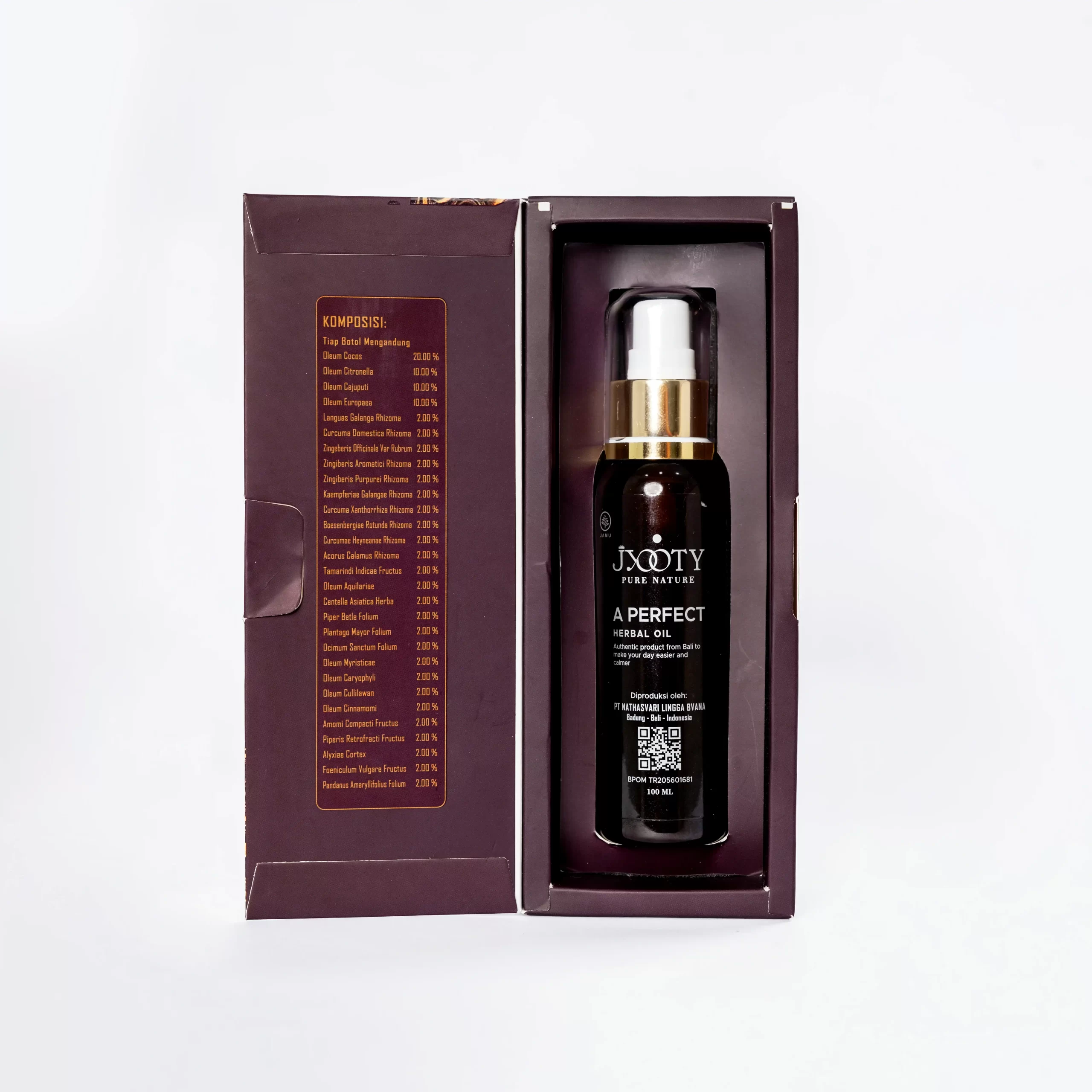 Jyooty Herbal Oil merupakan minyak dari berbagai campuran rempah Ayurvedic pilihan yang merupakan saripati dari 36 jenis bahan rempah seperti Akar, Batang, Daun, Bunga, dan Buah. Rempah-rempah yang telah terbukti secara turun temurun sejak ribuan tahun mampu memelihara dan membantu proses peryembuhan secara alami. Kami mengutamakan bahan yang terbuat dari Herb yang langsung dipetik dari alam secara fresh dan diolah dari berbagai campuran rempah Ayurvedic pilihan, sehingga olahan dari semua kandungan bahan bisa terserap secara maksimal dan sempurna. Jyooty Herbal Oil memiliki aroma dan ciri khas tersendiri yang belum ada dalam Healing Oil manapun. Aromanya yang menenangkan mampu menstimulasi sel-sel otak sehingga menimbulkan efek relaksasi dan dapat membantu menghilangkan stress secara perlahan. Jyooty Herbal Oil tidak hanya baik digunakan untuk kesehatan tapi juga baik untuk kecantikan kulit, bisa dibalurkan keseluruhan tubuh sehabis mandi.